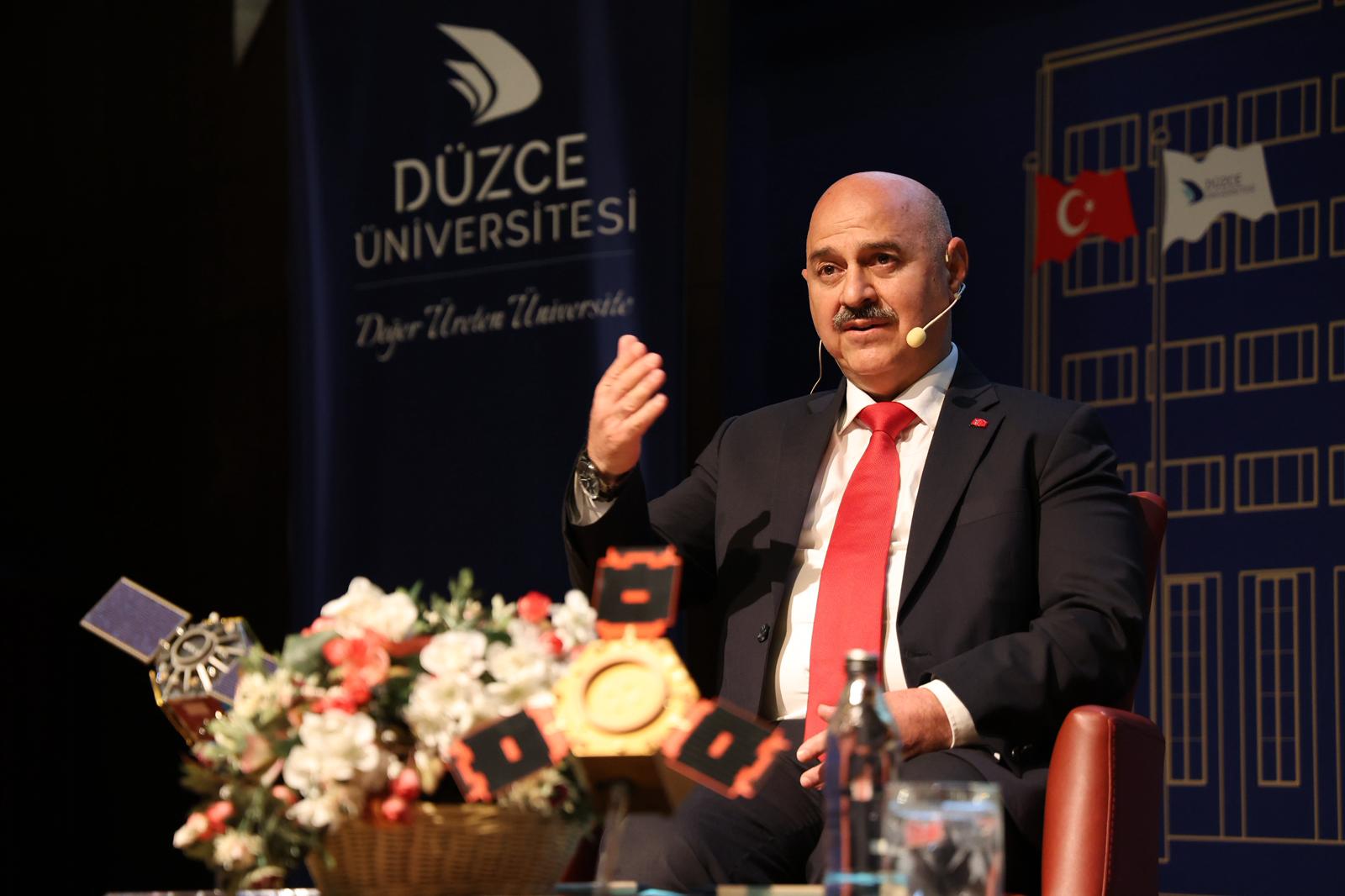 Öğrencileri proje yapmaya daha fazla teşvik etmek için Teknoloji Sokağı oluşturacaklarını ifade eden Prof. Dr. Sözbir, proje başarılarının iş hayatında öğrencileri her zaman bir adım öne taşıyacağını dillendirdi. Nitelikli eğitimi, donanımlı akademik kadrosuyla Düzce Üniversitesi’nin, Üniversite İzleme ve Değerlendirme Genel Raporu’nda, mezunların yurt içi ilk iş bulma süresinin en kısa olduğu üniversiteler arasında 13. sırada bulunduğunu ifade eden Sözbir, bu başarının Düzce Üniversitesi’nin eğitim kalitesini de gösterdiğini vurguladı. Hikmetli bilgi, akıl ve cesaretin birleşimiyle başarının geldiğini söyleyen Düzce Üniversitesi Prof. Dr. Nedim Sözbir, öğrencilerden gelen soruları da yanıtlayarak sözlerini sonlandırdı.