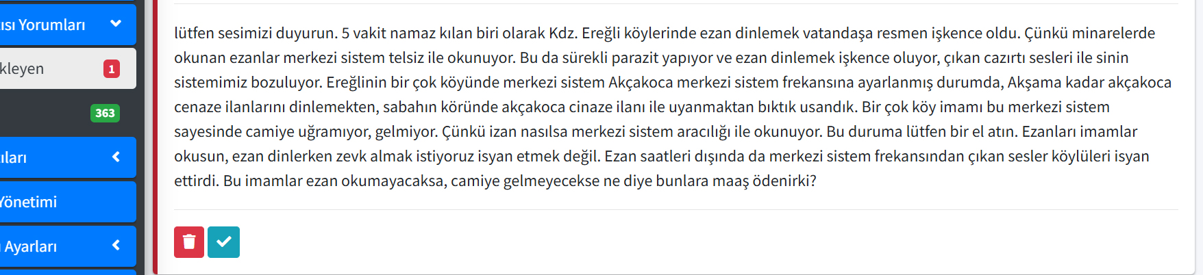 “Lütfen sesimizi duyurun. 5 vakit namaz kılan biri olarak, Kdz. Ereğli köylerinde ezan dinlemek vatandaşa resmen işkence oldu. Çünkü minarelerde okunan ezanlar merkezi sistem telsiz ile okunuyor. Bu da sürekli parazit yapıyor ve ezan dinlemek işkence oluyor, çıkan cazırtı sesleri ile sinin sistemimiz bozuluyor. Ereğli’nin birçok köyünde merkezi sistem Akçakoca merkezi sistem frekansına ayarlanmış durumda, Akşama kadar Akçakoca cenaze ilanlarını dinlemekten, sabahın köründe Akçakoca cenaze ilanı ile uyanmaktan bıktık usandık. Birçok köy imamı bu merkezi sistem sayesinde camiye uğramıyor, gelmiyor. Çünkü izan nasılsa merkezi sistem aracılığı ile okunuyor. Bu duruma lütfen bir el atın. Ezanları imamlar okusun, ezan dinlerken zevk almak istiyoruz isyan etmek değil. Ezan saatleri dışında da merkezi sistem frekansından çıkan sesler köylüleri isyan ettirdi. Bu imamlar ezan okumayacaksa, camiye gelmeyecekse ne diye bunlara maaş ödenirki?”