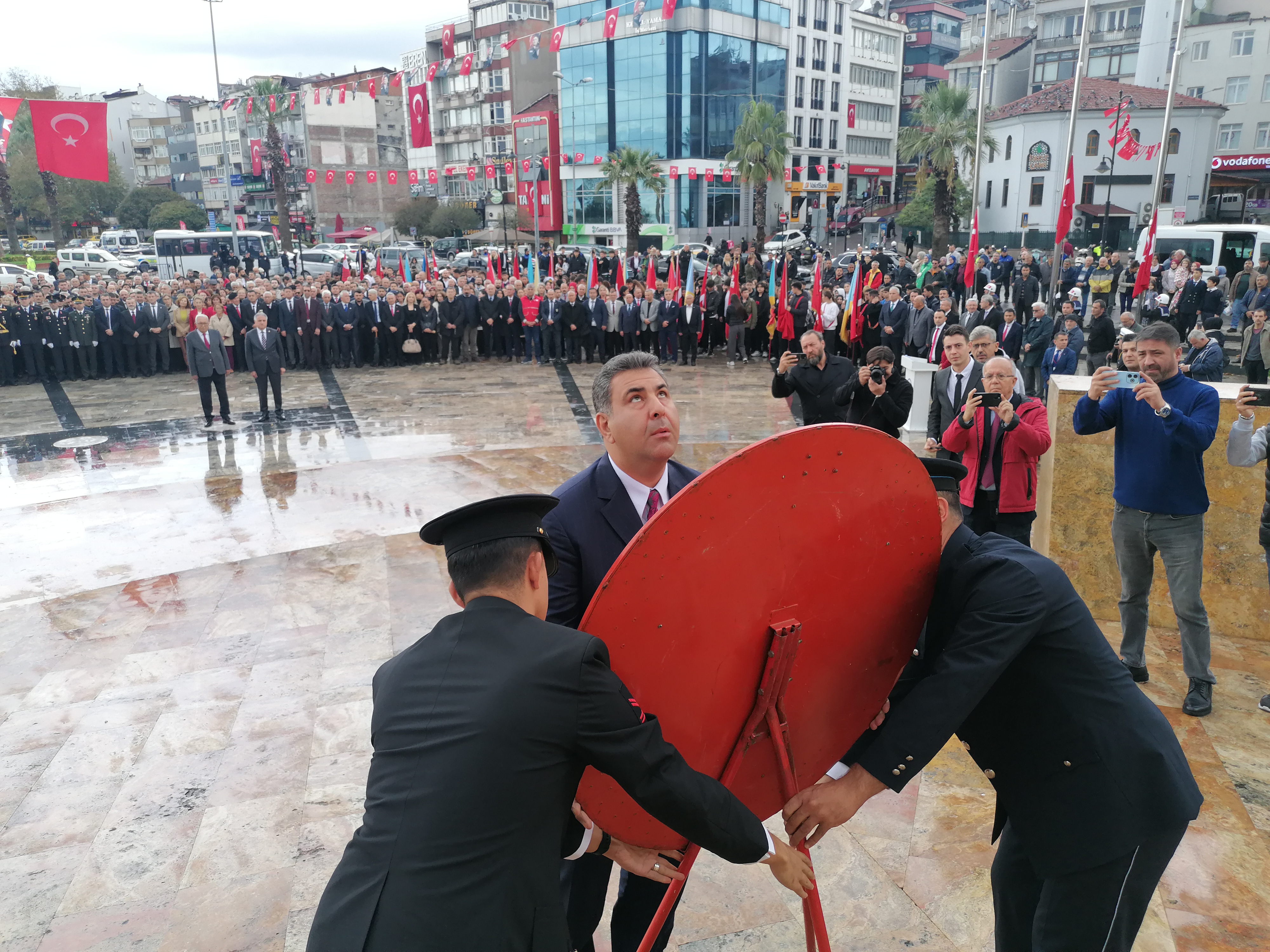 Atatürk Anıtı’nda 13.00’da yapılan törende Ereğli Kaymakamlığı, Ereğli Belediye Başkanlığı ve Garnizon Komutanlığı çelenkleri anıta bırakıldı. Saygı duruşunda bulunulup İstiklal Marşı söylendi. Garnizon askerleri göndere üç Türk Bayrağı çekti. Yoğun katılımla gerçekleştirilen tören sona erdi. Saat 14.00’da Polisevi ile anıt arası yapılacak Cumhuriyet Yürüyüşü anons ile hatırlatıldı.