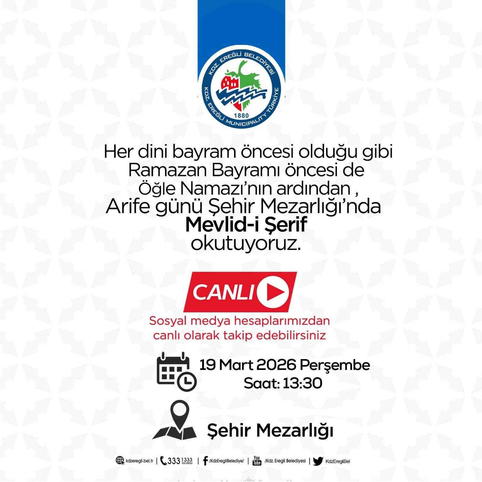 Karadeniz Ereğli Belediyesi, arife günü şehir mezarlığında mevlid-i şerif programı gerçekleştirecek.