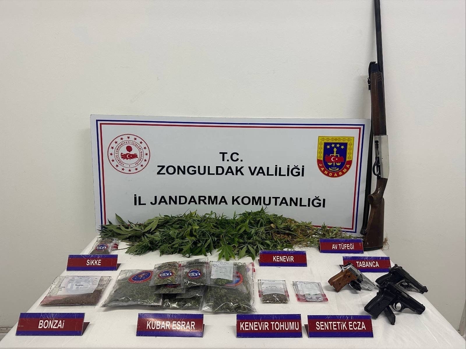 Zonguldak İl Jandarma Komutanlığı ekiplerince, Narkotik Suçlarla Mücadele kapsamında, Alaplı ilçesinde operasyon düzenlendi. Operasyonda 308 gram kubar esrar, 35 gram kenevir tohumu, 27 Gram bonzai, 14 kök kenevir bitkisi, 6 adet sentetik ecza hap, 2 adet uyuşturucu madde kullanma aparatı, 2 adet ruhsatsız tabanca, 1 adet kuru sıkı tabanca, 18 adet 9 mm tabanca fişeği, 15 adet 9 mm kurusıkı tabanca fişeği, 16 adet sikke, 1 adet av tüfeği, 2 adet cep telefonu ele geçirildi. Olayla ilgili yakalanan 2 şüpheli sevk edildikleri adli makamlarca adli kontrol şartıyla serbest bırakıldı.
