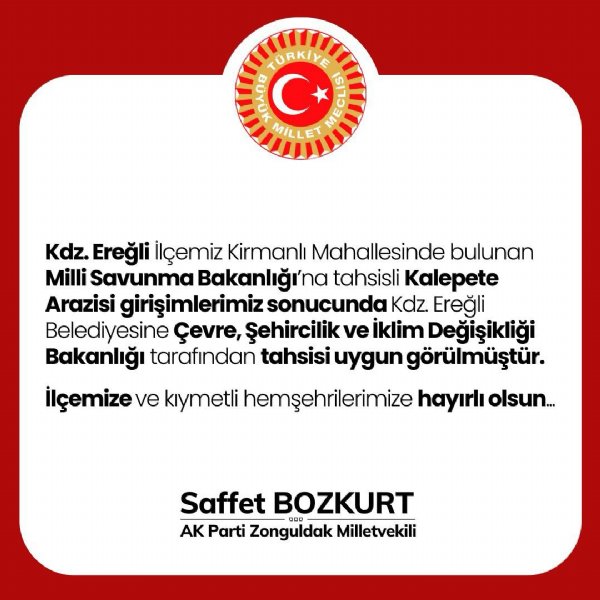 “Karadeniz Ereğli ilçemiz Kirmanlı Mahallesi’nde bulunan Milli Savunma Bakanlığı’na tahsisli Kalepete arazisi girişimlerimiz sonucunda Karadeniz Ereğli Belediyesi’ne Çevre, Şehircilik ve İklim Değişikliği Bakanlığı tarafından tahsisi uygun görülmüştür. İlçemize ve kıymetli hemşerilerimize hayırlı olsun.”