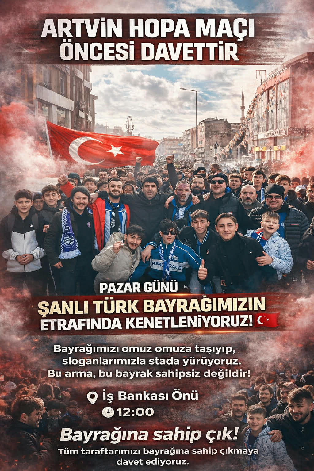 "Bu hafta pazar günü oynayacağımız Artvin Hopa maçı öncesinde İş Bankası önünde toplanarak büyük Türk bayrağımızı açacak ve hep birlikte stada yürüyeceğiz. Tüm taraftarlarımızı İş Bankası önü, saat 12:00’de toplanmaya davet ediyoruz."