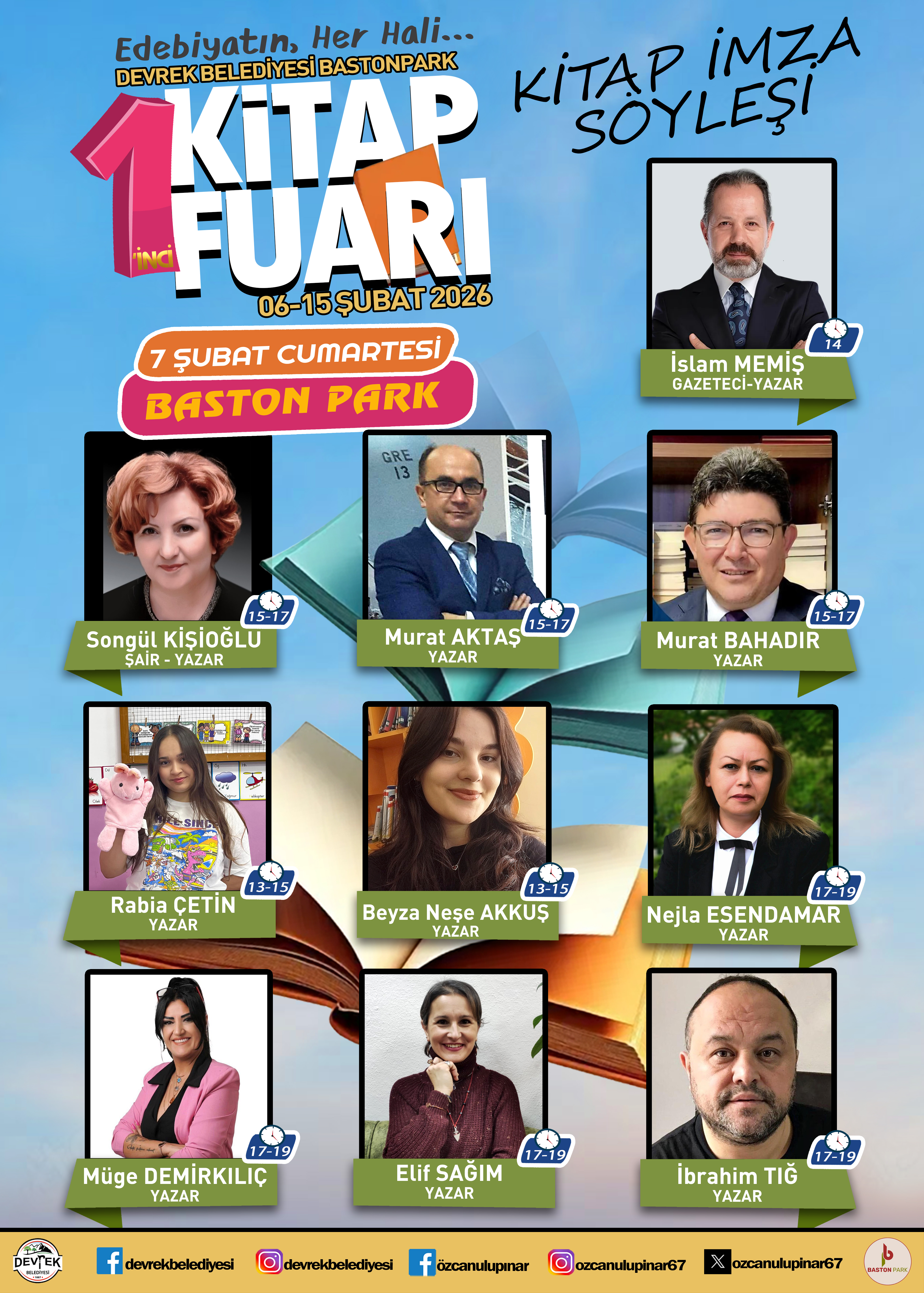 “7 Åubat Cumartesi günü resmi açılışı yapılacak fuarda; Prof. Dr. Oytun ErbaÅŸ, Ekonomi yorumcusu İslam MemiÅŸ ve birçok kıymetli yazar ile çocuk yazarları olacak. SöyleÅŸiler, imza günleri ve kitaplarla dolu bu özel atmosferde her yaÅŸtan ziyaretçimizi bilgiyle ve kültürle buluÅŸturuyoruz. Kitabın ışığında buluÅŸmak için sizleri Bastonpark 1. Kitap Fuarı’na bekliyoruz.