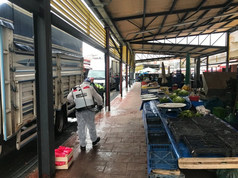 Halkın yoğun bulunduğu ortak kullanım alanlarını sürekli olarak dezenfekte eden Veteriner İşleri Müdürlüğü Vektör İlaçlama ve Kontrol Merkezi ekipleri, bugün sabah erken saatlerde merkez pazar yerini dezenfekte etti. Çalışmalar Tuhafiyeciler Çarşısı’nda devam etti.