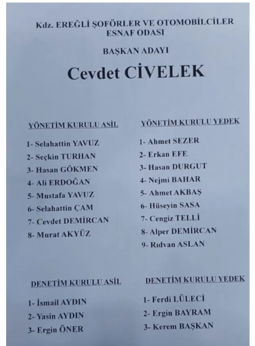 Tek liste ile yapılan kongrede, mevcut başkan Cevdet Civelek yeniden delegelerin karşısına çıktı. Civelek, yeni dönemde de istikrarı ve güçlü temsili önceleyen bir anlayışla yoluna devam etmeyi hedeflediğini vurguladı. Oluşturduğu yeni listeyle şoför esnafının güçlü isimler ile güven tazelediğini belirten Civelek, önümüzdeki dönemde de oda çalışmalarını kararlılıkla sürdüreceklerini ifade etti.