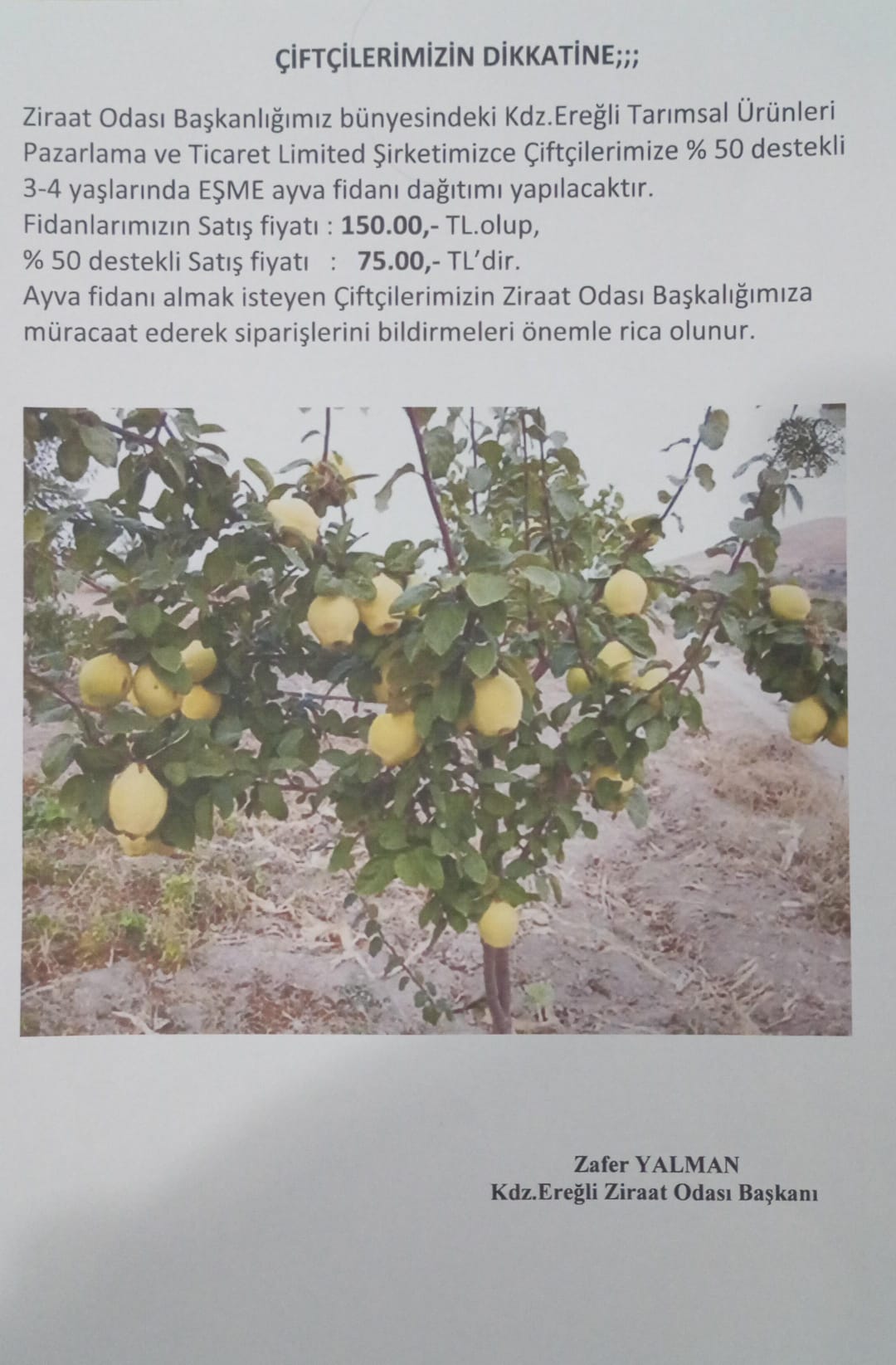 “Ziraat Odası Başkanlığımız bünyesindeki Kdz. Ereğli Tarımsal Ürünleri Pazarlama ve Ticaret Limited Şirketimizce Çiftçilerimize %50 destekli3-4 yaşlarında EŞME ayva fidanı dağıtımı yapılacaktır. Fidanlarımızın satış fiyatı 150.00, TL olup %50 destekli satış fiyatı 75.00,TL'dir. Ayva fidanı almak isteyen Çiftçilerimizin Ziraat Odası Başkalığımıza müracaat ederek siparişlerini bildirmeleri önemle rica olunur.”