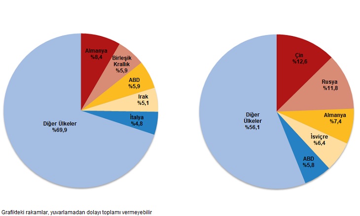İthalatta Çin ilk sırayı aldı. Ekim ayında Çin'den yapılan ithalat 3 milyar 977 milyon dolar olurken, bu ülkeyi sırasıyla; 3 milyar 712 milyon dolar ile Rusya Federasyonu, 2 milyar 326 milyon dolar ile Almanya, 2 milyar 5 milyon dolar ile İsviçre, 1 milyar 828 milyon dolar ile ABD izledi. İlk 5 ülkeden yapılan ithalat, toplam ithalatın %43,9'unu oluşturdu. Ocak-Ekim döneminde ithalatta ilk sırayı Çin aldı. Çin'den yapılan ithalat 40 milyar 731 milyon dolar olurken, bu ülkeyi sırasıyla; 35 milyar 508 milyon dolar ile Rusya Federasyonu, 24 milyar 598 milyon dolar ile Almanya, 14 milyar 570 milyon dolar ile ABD, 12 milyar 886 milyon dolar ile İtalya izledi. İlk 5 ülkeden yapılan ithalat, toplam ithalatın %42,9'unu oluşturdu.