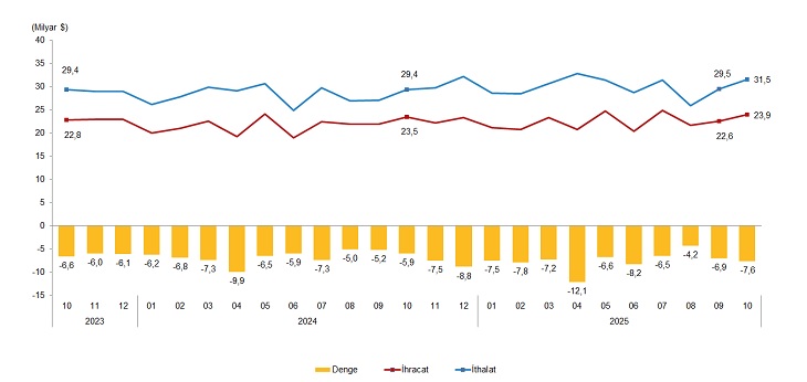 Ekim ayında dış ticaret açığı bir önceki yılın aynı ayına göre %27,6 artarak 5 milyar 938 milyon dolardan, 7 milyar 580 milyon dolara yükseldi. İhracatın ithalatı karşılama oranı 2024 Ekim ayında %79,8 iken, 2025 Ekim ayında %76,0'a geriledi.