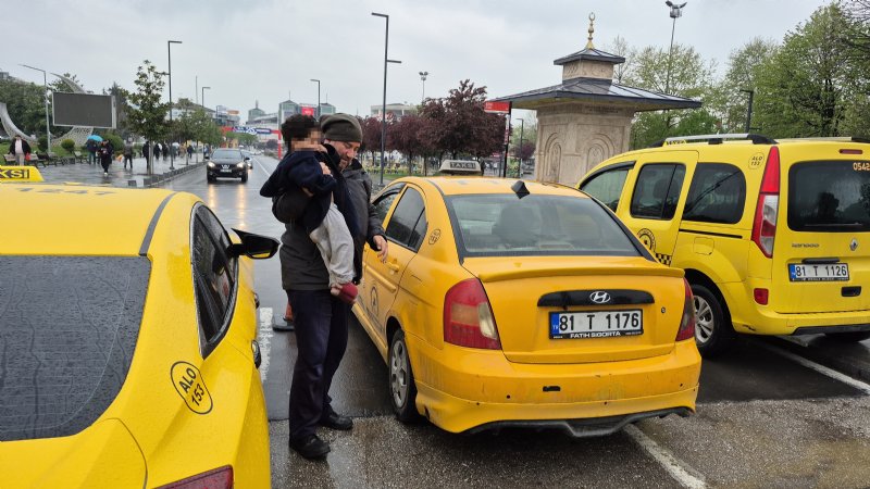 Düzce Valiliği önündeki durağa müşterisini bırakıp dönen bir taksici, kaldırımda tek başına bekleyen, üstü çamurlu ve ıslak olan 3 yaşında yabancı uyruklu çocuğu fark etti. Kaybolduğunu düşündüğü çocuğu hava soğuk olduğu için hemen taksisine alan taksici, durağa gelerek önce ısıttı. Yağmur sebebiyle üstü ıslak olan çocuğu ısıtmak için soba başına oturtan taksiciler, yeni kıyafette aldı. Taksiciler meyve suyu ve poğaça vererek miniğin karnını da doyurdu.