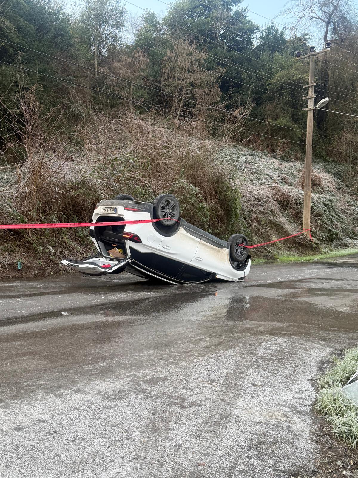 Karadeniz Ereğli’de buzlu yolda kontrolden çıkan otomobil takla atarak ters döndü.