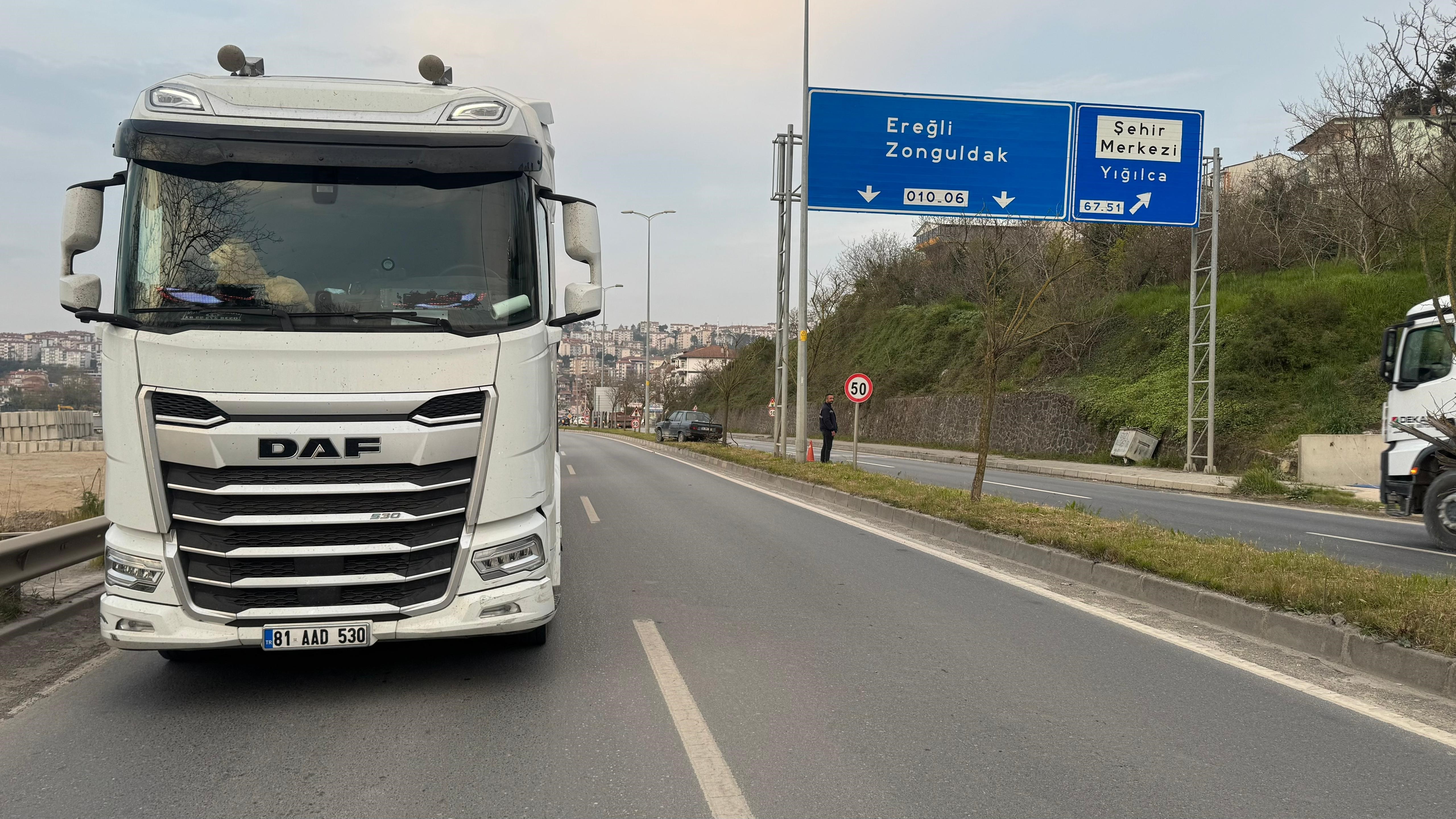 O.K idaresindeki Akçakoca istikametine seyir halinde 81 AAD 530 plakalı tır, A.K’nun kullandığı 14 BK 373 plakalı otomobile çarptı. Savrulan otomobil refüje çıkarak durabildi. Olayda herhangi bir yaralanma yaşanmadığı bildirildi. Olay yeri güvenlik önlemi alan trafik ekibi kaza ile ilgili inceleme yaptı.