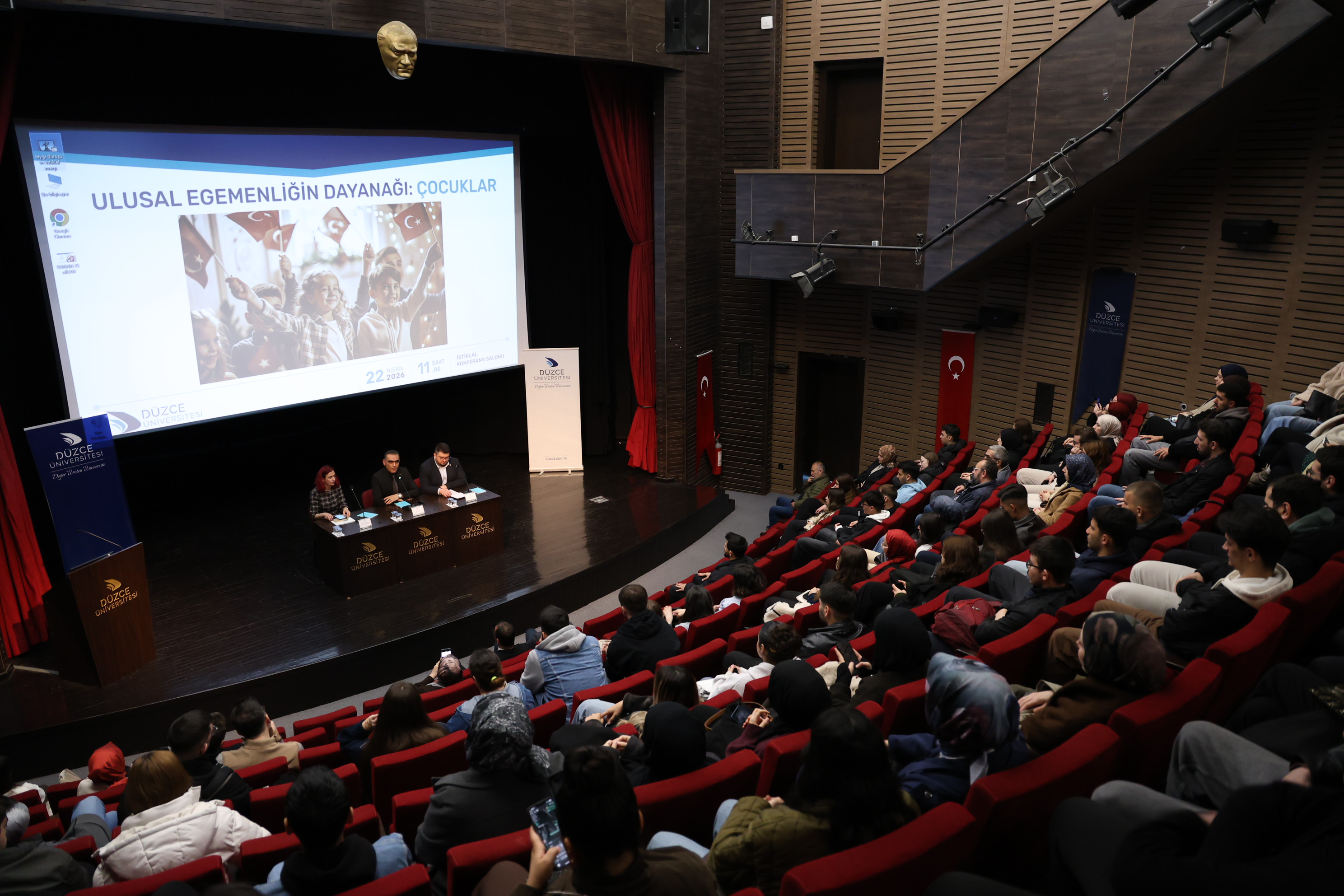 Düzce Üniversitesi Fen Edebiyat Fakültesi ile Sanat Tasarım ve Mimarlık Fakültesi tarafından, TBMM’nin açılışının 106. yıl dönümü ve 23 Nisan Ulusal Egemenlik ve Çocuk Bayramı dolayısıyla düzenlenen “Ulusal Egemenliğin Dayanağı: Çocuklar” başlıklı panel, İstiklal Konferans Salonu’nda öğrencilerin yoğun ilgisiyle gerçekleştirildi. Programa; Rektör Yardımcısı Prof. Dr. Emrah Evren Kara, akademisyenler ve öğrenciler katılım sağladı.